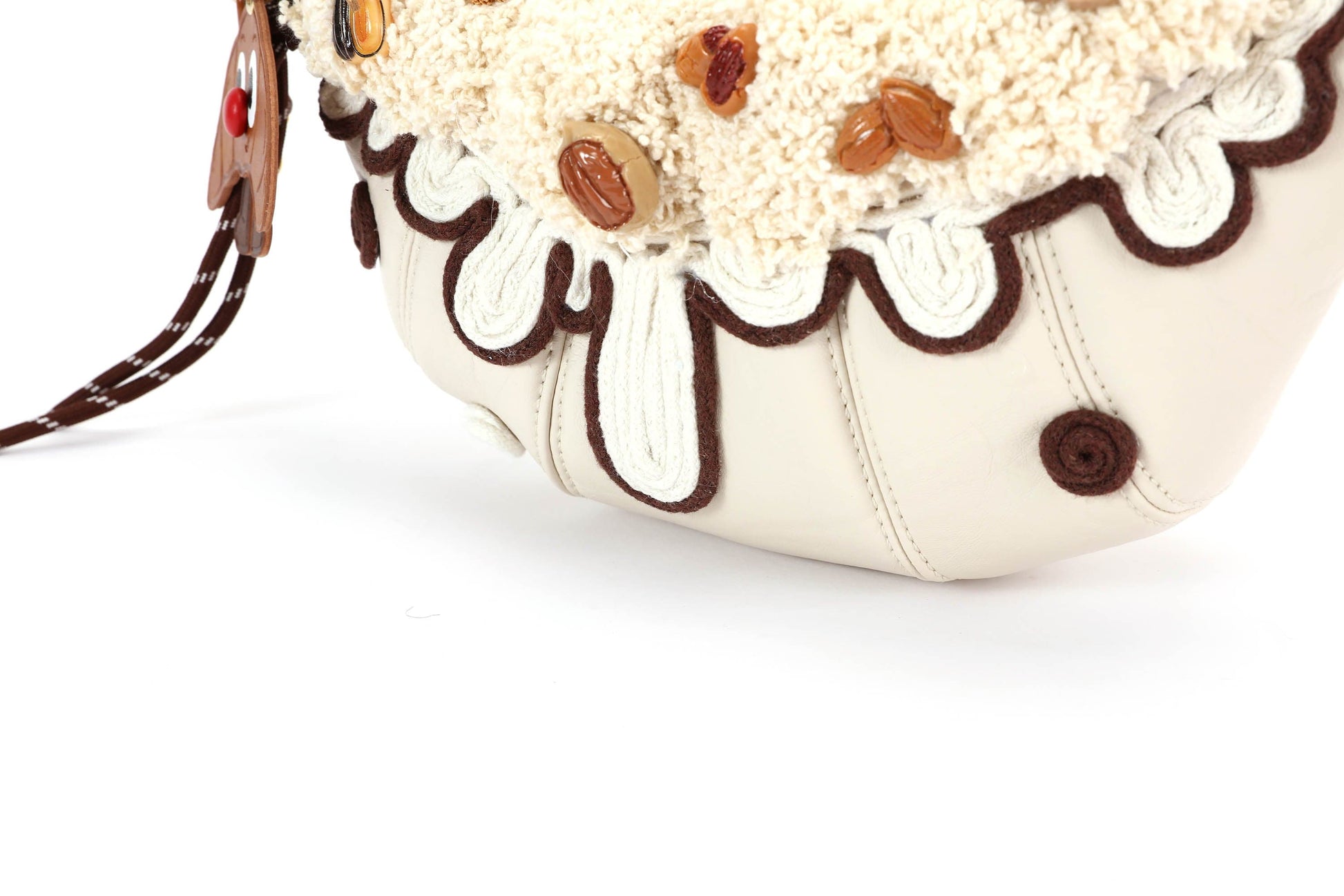 - Textured boucle flap adorned with whimsical appliqués and resin accents