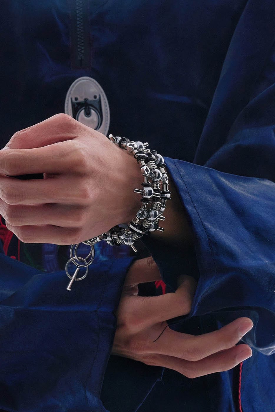 - Multiple metal rings and a T-bar clasp enhance the distinctive aesthetic